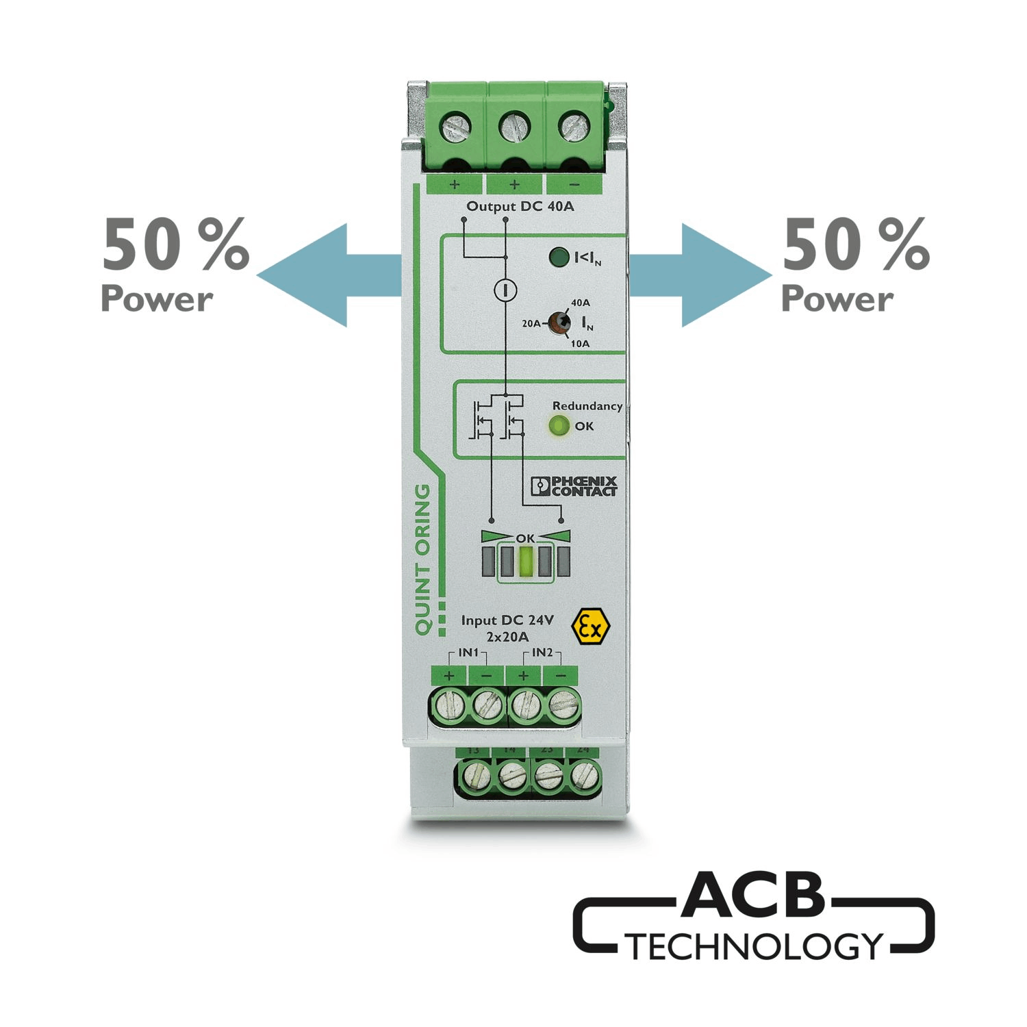 A QUINT-ORING/24DC/2X10/1X20 egy aktív redundancia modul , amelyet DIN-sínre szereléshez terveztek. Biztosítja 100% leválasztást két párhuzamos 24V DC tápegység között, növelve a rendszer megbízhatóságát kritikus ipari alkalmazások esetén. Az Auto Current Balancing (ACB) technológiával egyenletesen osztja el a terhelési áramokat, meghosszabbítva a redundáns táprendszerek élettartamát.